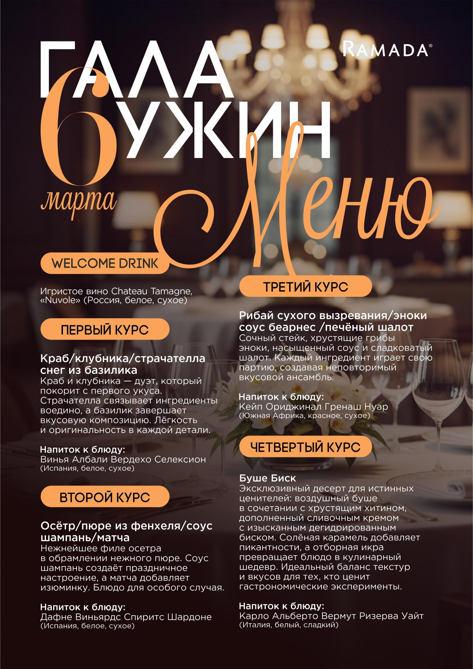 - Уникальное авторское меню и шоу-подача от шеф-повара отеля Рамада Евгения Паршукова