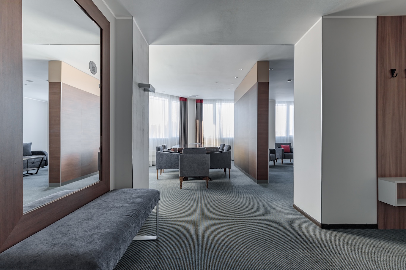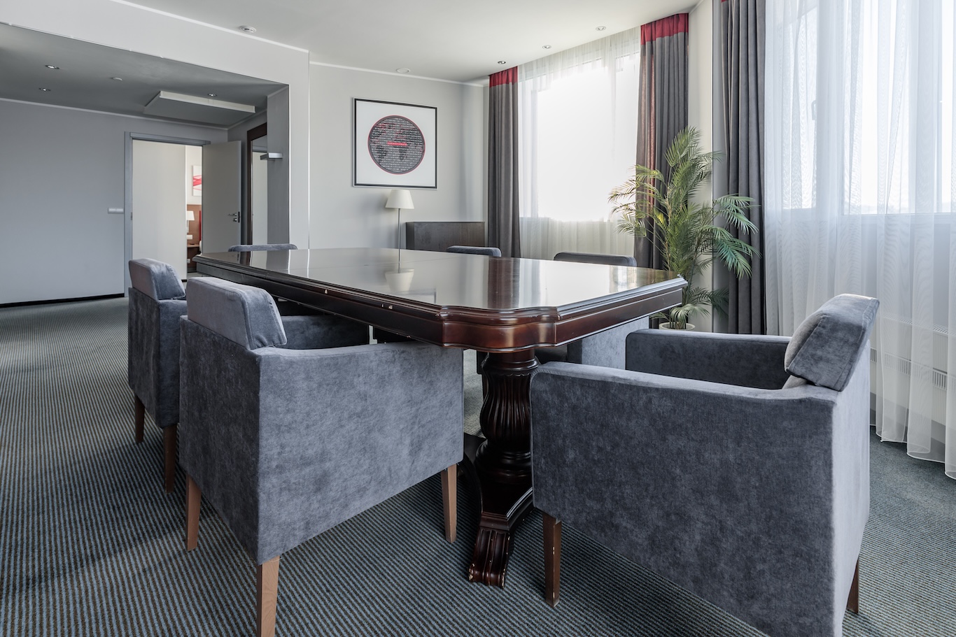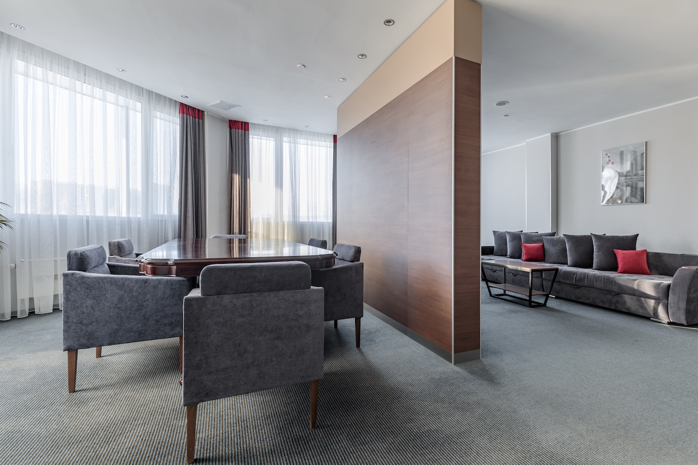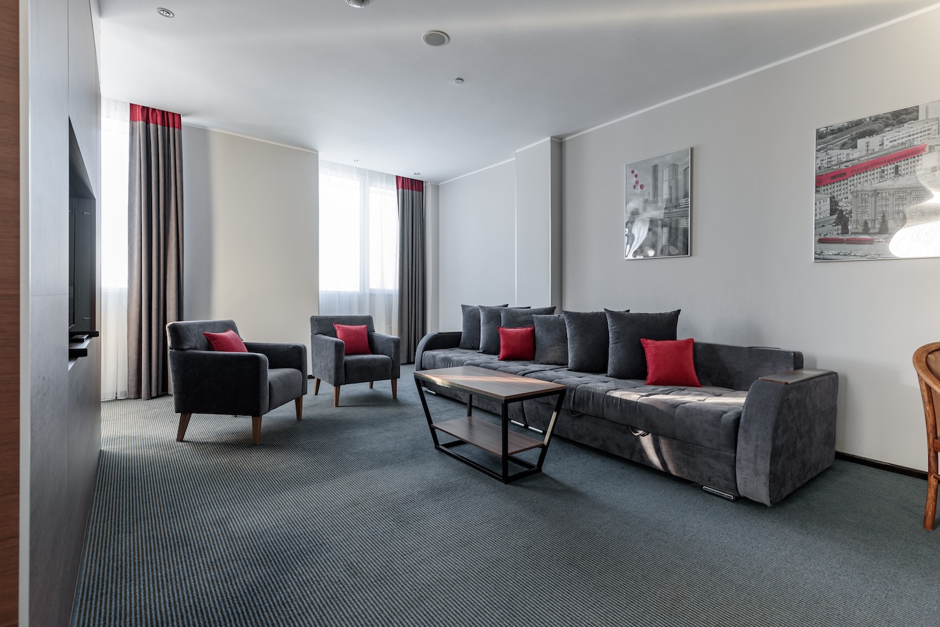 Просторный номер (84 кв.м) для семьи или компании до 5 человек, состоит из отдельной спальной комнаты с двуспальной кроватью и гостиной, разделенной на несколько функциональных зон: зоной отдыха с большим мягким диваном и телевизором, рабочей и обеденной зоной.