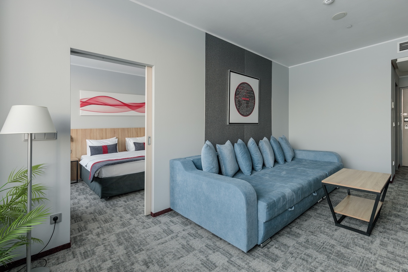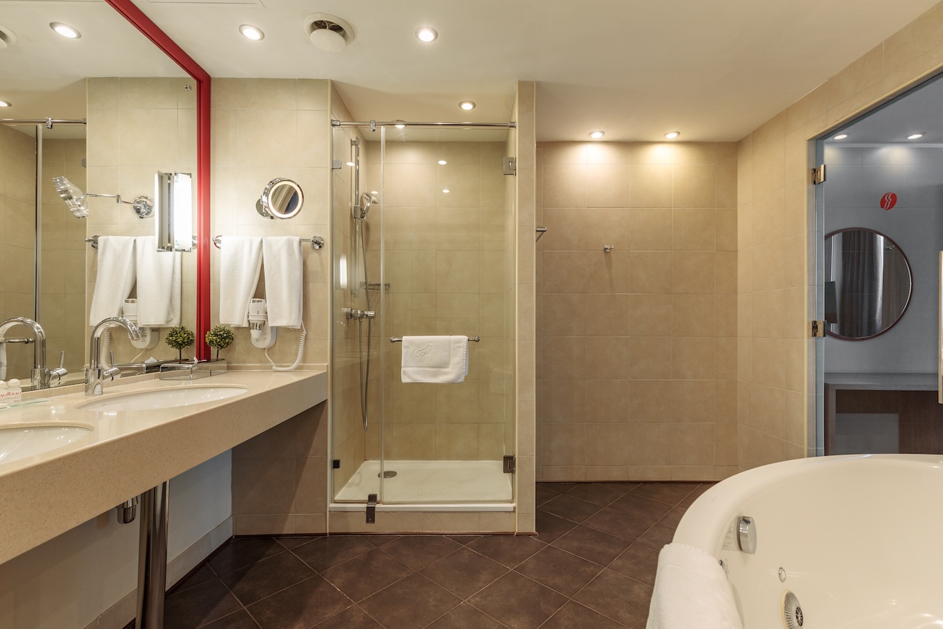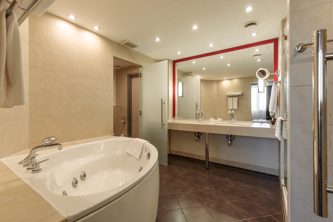Состоит из уютной гостиной и спальной комнаты с двуспальной кроватью. В ванной комнате душевая кабина и джакузи.